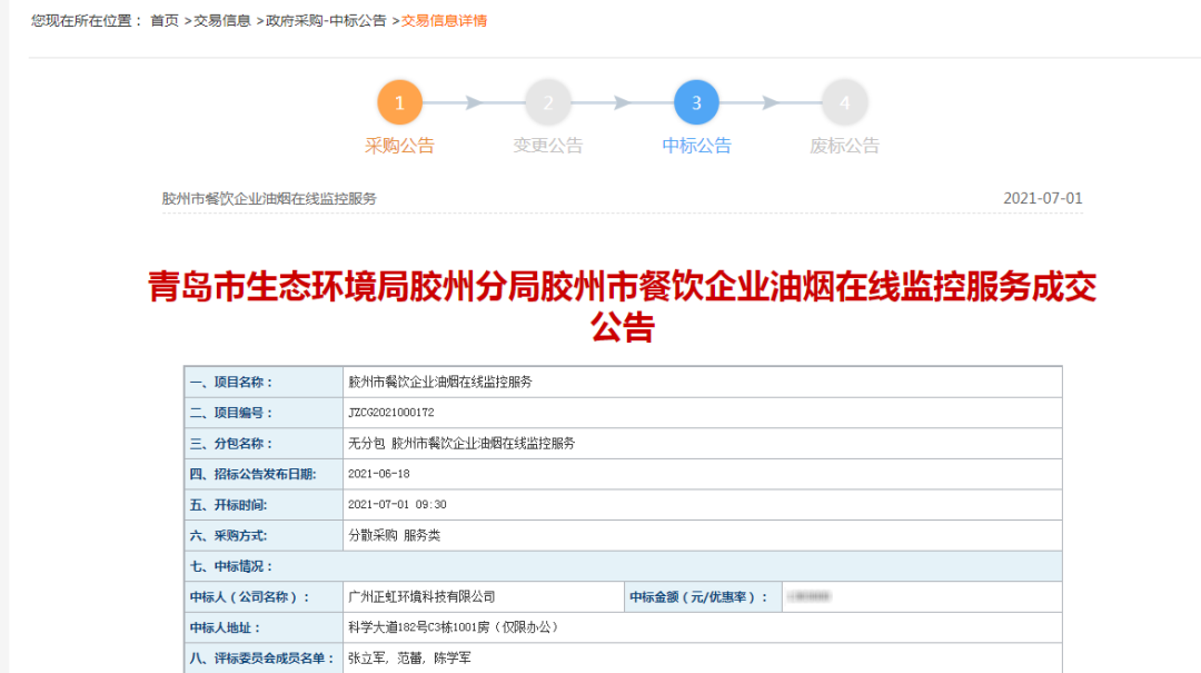 在青岛市生态环境局胶州分局胶州市餐饮企业油烟在线监控服务项目中,我司成功中标。